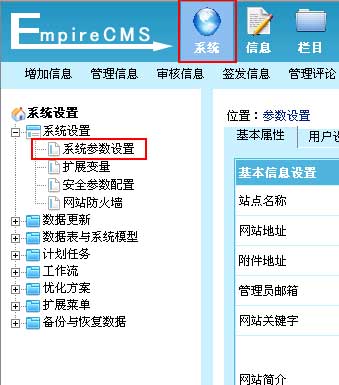 1、登录后台,单击“系统”菜单,选择“系统参数设置”子菜单,进入网站信息配置界面: