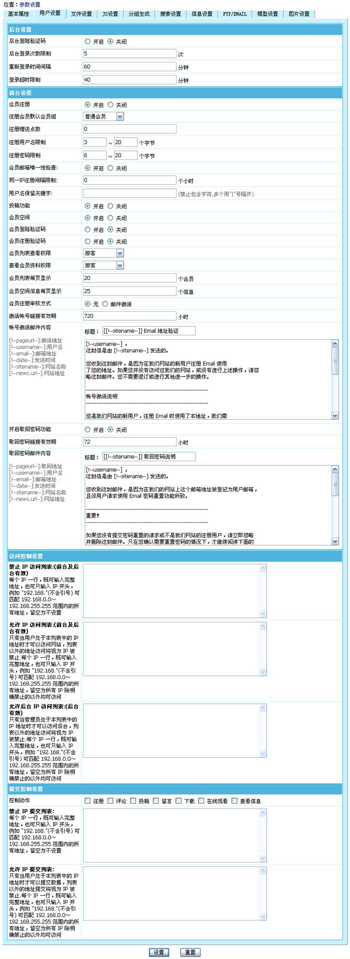 会员表单附件设置:会员注册与修改资料表单是否允许上传图片/附件,及允许上传的大小及扩展名。