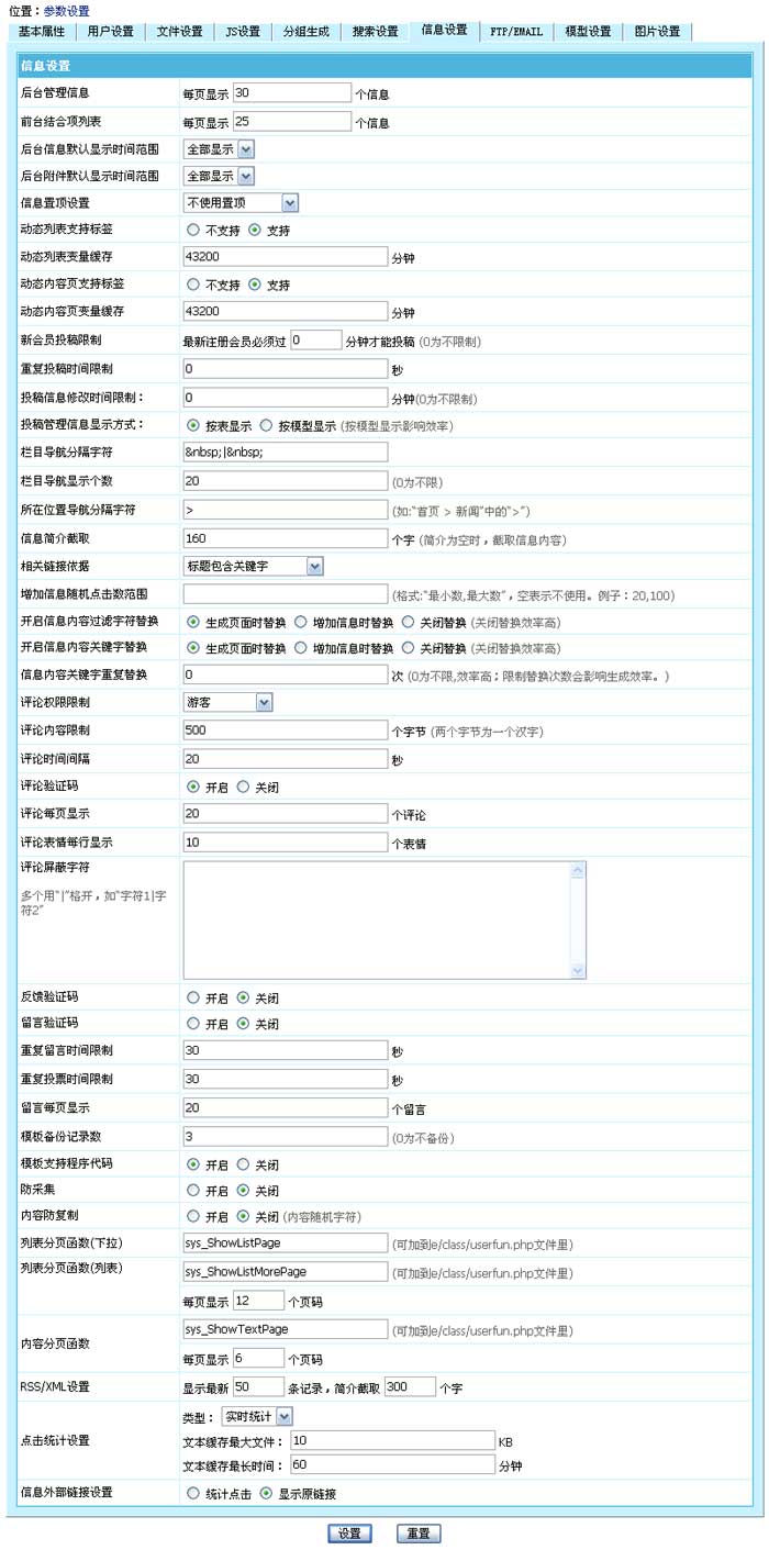 点击统计设置:“实时统计”为访问时直接点击量加1;“文本缓存”为将访问记录缓存下来,达到一定数才更新(访问量大时效率高);“不统计”为关闭点击数统计。