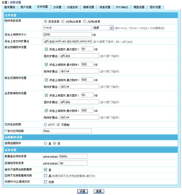 附件存放目录:选择附件存放目录的三种形式—栏目目录即d/file/栏目目录;d/file/p目录;d/file目录存放。以及设置存放日期目录格式。