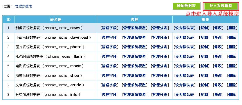 1、登录后台,单击“系统”菜单,选择“管理数据表”子菜单,进入管理数据表界面: