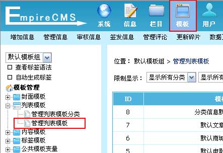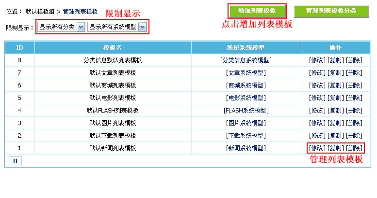 1、登录后台,单击“模板”菜单,选择“管理列表模板”子菜单,进入管理列表模板界面: