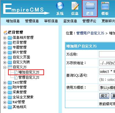1、登录后台,单击"栏目"菜单,选择"增加自定义JS"子菜单,进入增加自定义JS界面: