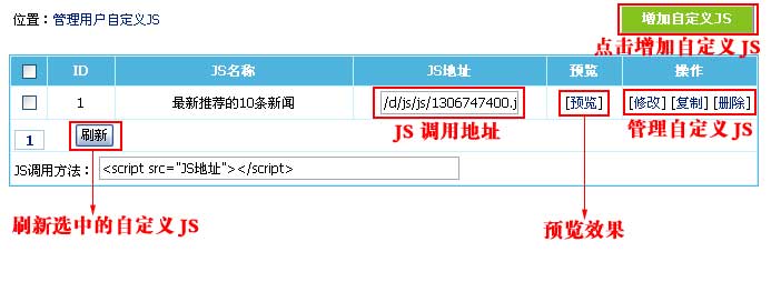 3、增加自定义JS后,返回管理自定义JS页面,如下图: